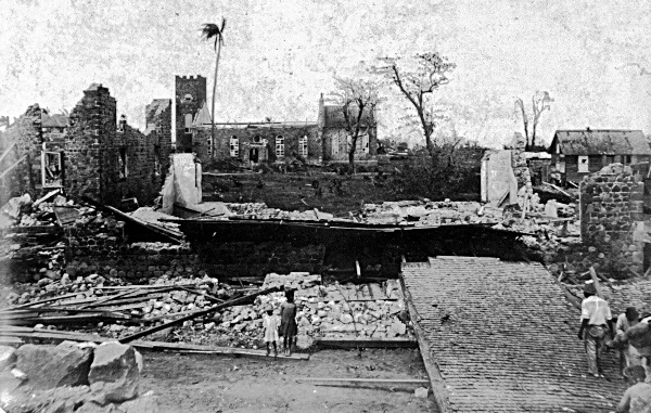 The photo shows the devastation caused by the1898 hurricane. The Georgetown Methodist Church is completely flattened. The Anglican church can be seen in the background. Click on the image to enlarge.