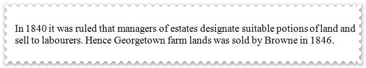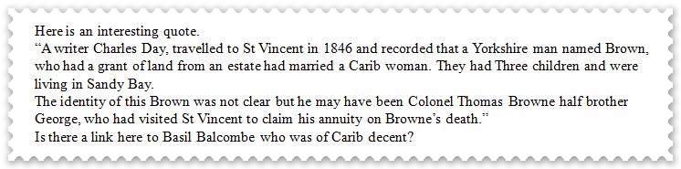 His son Thomas A Browne also a Reverend, (Brown mark 3) inherited his father's debts and was forced to sell off most of Grand Sable in 1846 to pay for these debts. He later returned to England, to become yet another absentee owner. George McIntosh Browne the second son of Reverend Thomas Browne becomes overseer of Grand Sable Estate, David Cowie in 1872 (of Argyle Estate) becomes manager. George McIntosh Browne married Jean McLeod in Georgetown, they lived in London for a while then returned to St Vincent, where he owned 60 acres of Grand Sable. 1,484 acres or thereabouts, was sold by Auction on the 6th of November 1872 in London. With such a huge monopoly in the town by the Browne family it is no wonder that it is often referred to as BROWNE'S TOWN.