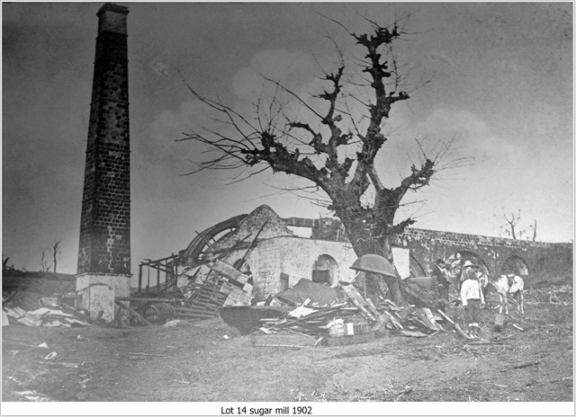 At Lot 14, the manager and his wife and family had shut themselves up in the rum cellar below the house, and firmly closed all doors and windows. They had a terrible experience, but they survived. All of those in the house itself or in the negro village were killed. It will be understood that as the tropical houses are so built as to secure free entrance of air, it is almost impossible to close them up securely, and the suffocating blast reached the interior and stifled all who were there. All the animals in the fields also perished.