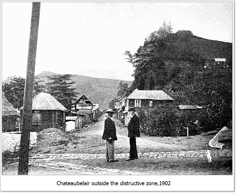 Chateaubelair, had been vacated during the afternoon of Wednesday, and its inhabitants were scattered through the villages and houses to the south, but on Thursday morning, as the noises from the mountain had almost ceased, people began to return, as soon as day broke, to see what damage their houses and crops had suffered during the night. From 3 to 5 inches of ashes had fallen in the village, and some of the houses had had their roofs perforated by falling stones. Others had collapsed under the weight of ash that accumulated on them. No buildings, however, had been set on fire, though on the slopes to the south and east of the town in more than one place the grass had been ignited, (probably by flashes of lightning). Most of trees had been stripped of their leaves, and the smaller branches had been broken by the falling stones.