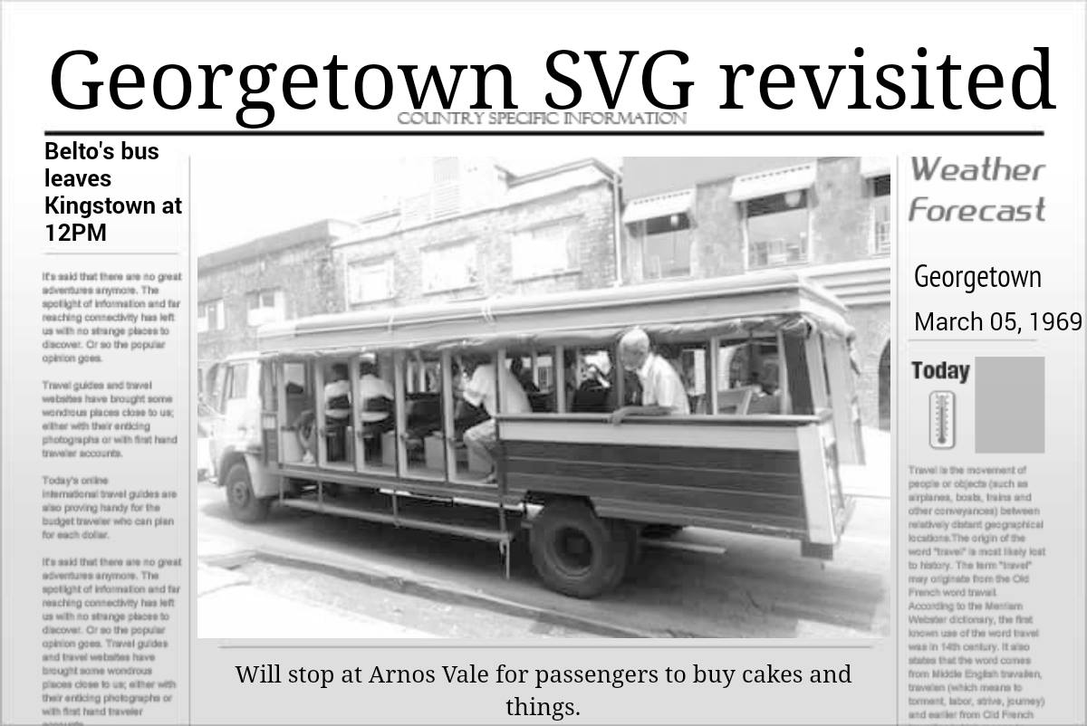 The buses would start their rounds to leave Kingstown, around 12.30 PM. They only made one trip per day so if you missed your bus, that was it. These buses carried everything, people,lumber, animal or what ever load you had. On the journey back to Georgetown, the driver would always stop at Arnos Vale to allow passengers to purchase cakes at Sunrise Bakery. And of course stop at the road block barrier if there were planes landing or taking off.The police often did a stop and check to ensure that the buses were not over loaded. I wish they would adapt this practice today.